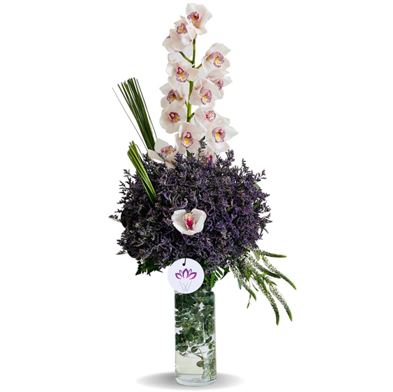This luxurious birthday present, known as the “Masterpiece,” exudes everlasting sophistication in any environment. It showcases an impressive display of orchids, veronica, and lemon balm, elegantly arranged in a modern cylindrical vase filled with vibrant foliage, enhancing any room with a touch of refinement and coziness.