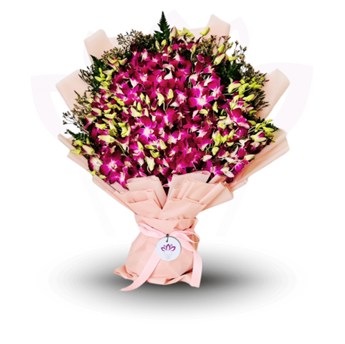 This sophisticated hand-tied bouquet, featuring 50 bright fuchsia mini orchids, is an outstanding present for a birthday. Each mini orchid represents beauty and refinement, signifying respect, affection, and class—ideal for expressing sincere birthday sentiments.