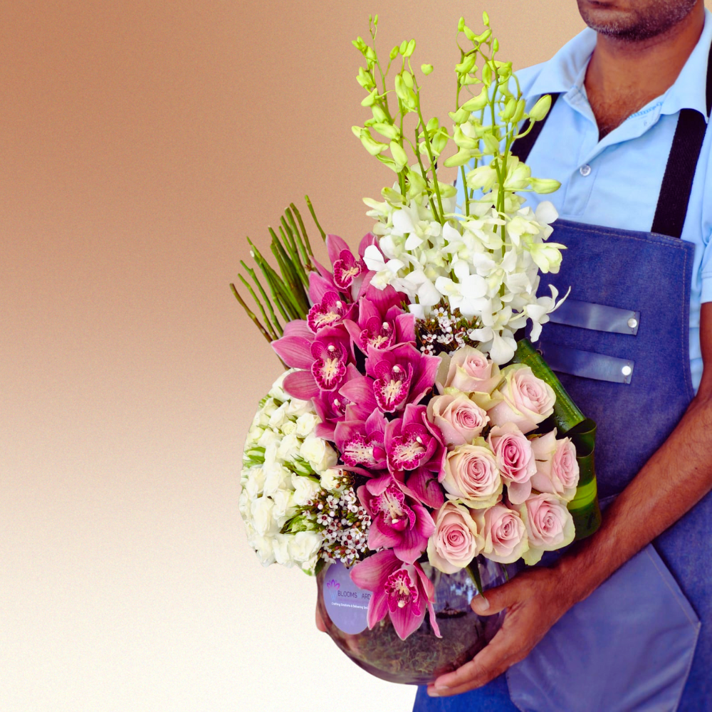 "Timeless & Classic," this exquisite pink blossom arrangement is a harmonious blend of elegance, grace, and charm. Showcasing the beauty of nature, this enchanting ensemble features a captivating combination of delicate pink roses, dainty pink cymbidium orchids, and ethereal white baby roses, complemented by starry orchids. Expertly crafted by Bloomsward’s skilled florists, these blooms are beautifully arranged in a round glass fishbowl, highlighting their natural splendor and ensuring a breathtaking presentation. The soft shades of pink blend seamlessly, creating a mesmerizing floral display that exudes femininity, serenity, and sophistication.
